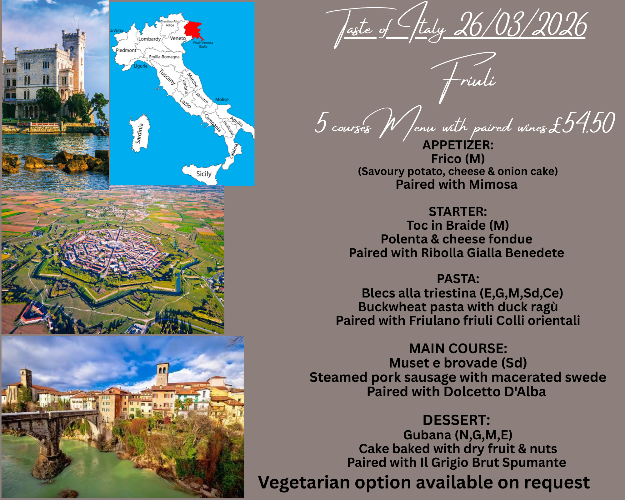 Back to All Events A taste of Italy, Friuli Venezia Giulia Thursday, March 26, 2026 5:30 PM 11:30 PM Rustico Italian Bistro 7 New Road Leighton Buzzard, England, LU7 2LS United Kingdom (map) Google Calendar ICS Book now